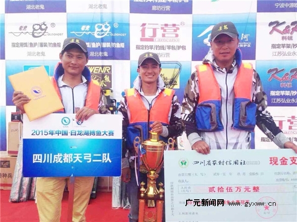 9月13日,2015中国•白龙湖搏鱼大赛圆满落幕。经过两天的激烈角逐,四川成都天弓二队第一天以总重84.2KG优势,第二天凭借25.3KG的成绩锁定胜局,最终以合计2分的成绩夺冠,赢得25万元大奖,陕西西安钓鱼俱乐部和陕西勉县搏浪队分别获得亚军和季军。